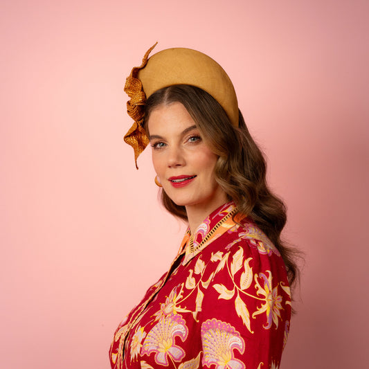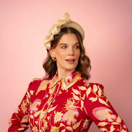 Amelia straw halo with knotted trim in gold Spring Racing Headpiece