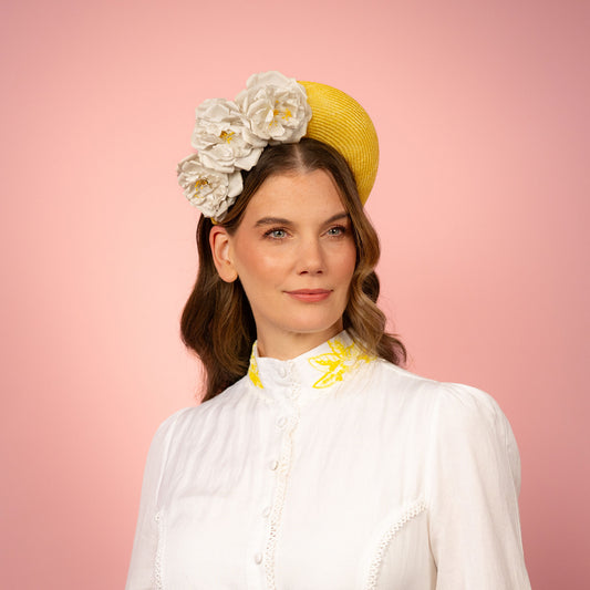 Emma Halo in yellow with vintage flowers Spring Racing Headpiece