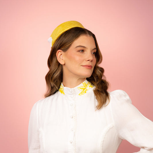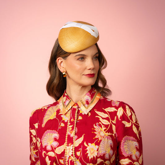 Peggy Pillbox in yellow straw with white petersham infinity bow Spring Racing Headpiece