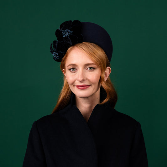 Cheyne Navy Felt Halo with Velvet Flowers Winter Racewear Headpiece