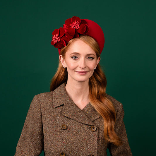 Cheyne Red Felt Halo with Velvet Flowers Winter Racewear Headpiece