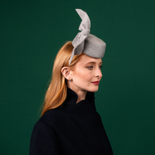 Cresta mini grey felt front of head pillbox with a felt knot trim Winter Racewear Headpiece