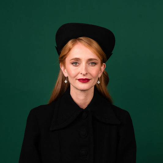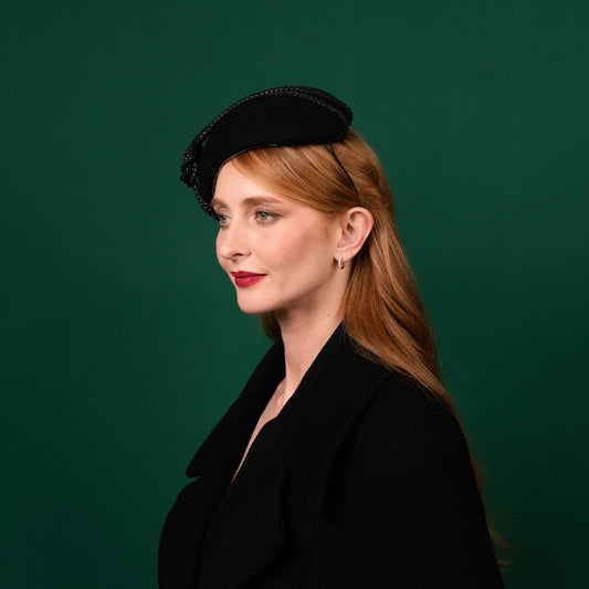 Gayle Black Felt Beret with Leather Rope Knot Trim Winter Racewear Headpiece