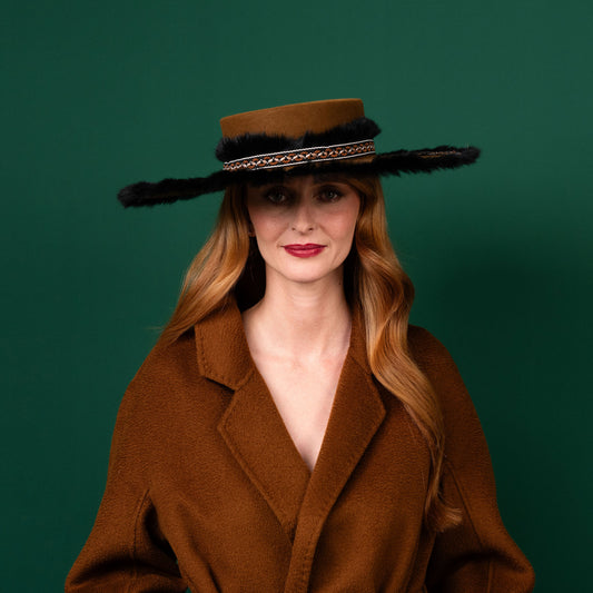 Glanford Caramel Felt Boater Hat with fluffy trim Winter Racewear Hat