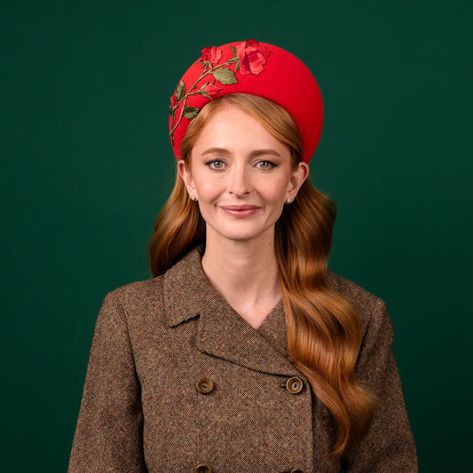 Hansonville Red Felt Halo with Embroidered Rose Flowers Winter Racewear Headpiece