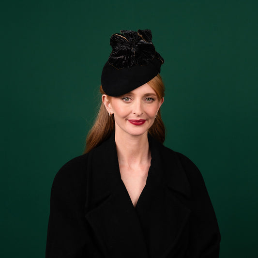 McLean Black Felt Beret with Black and Gold Velvet Flowers Winter Racewear Headpiece