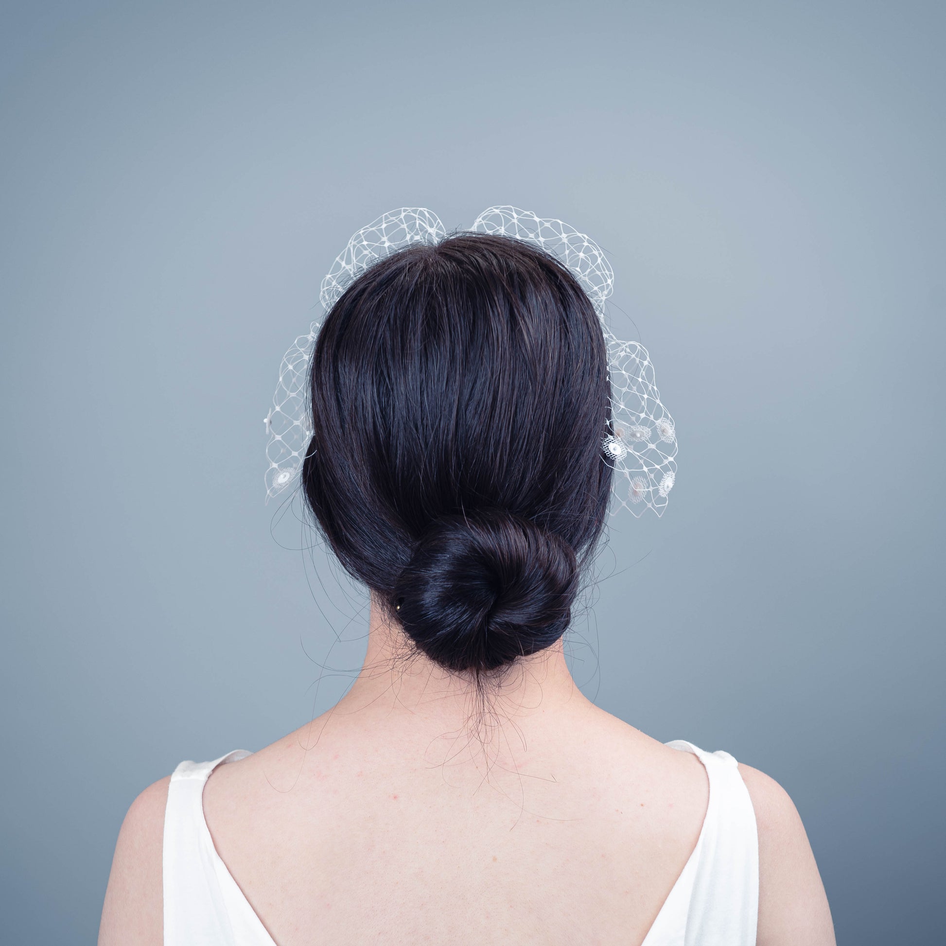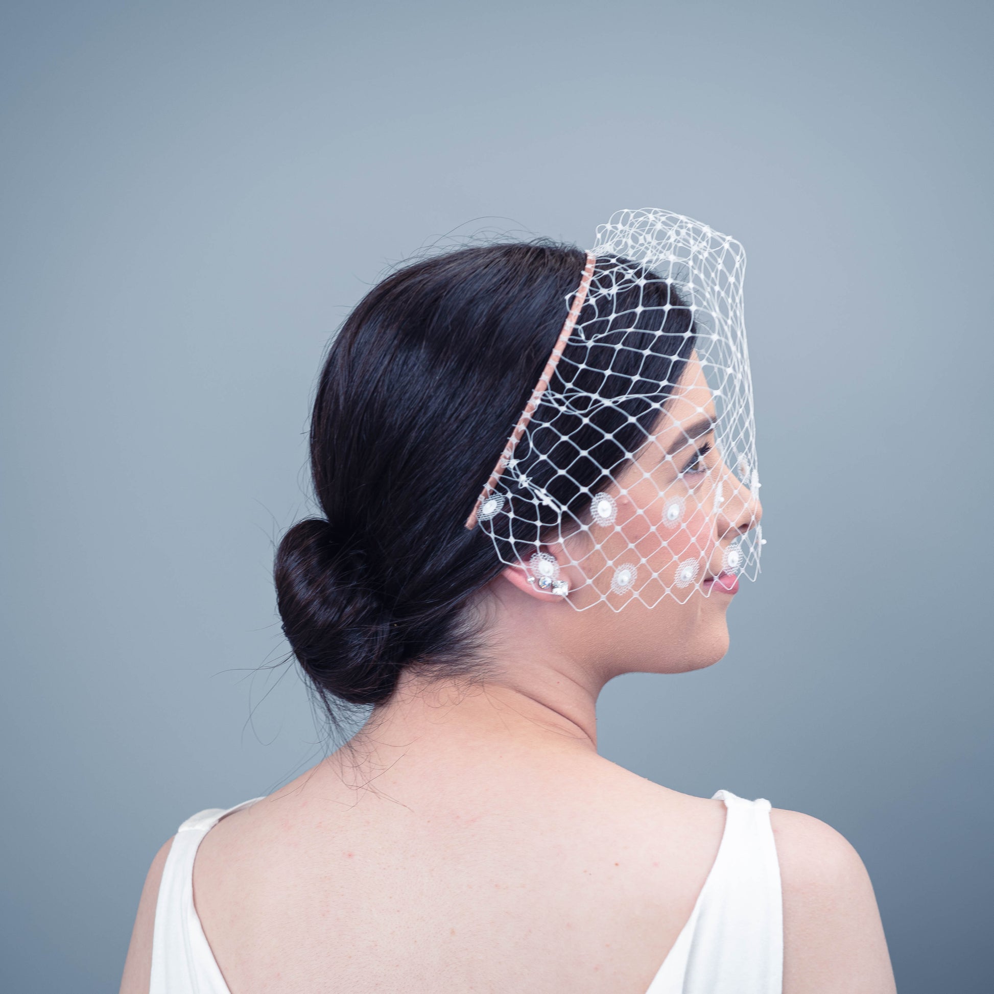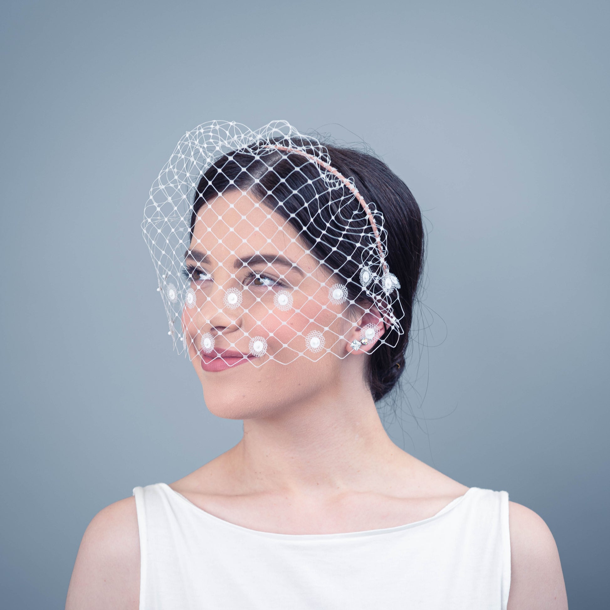 All of Me bridal birdcage veil on headband with white sequin polka dots