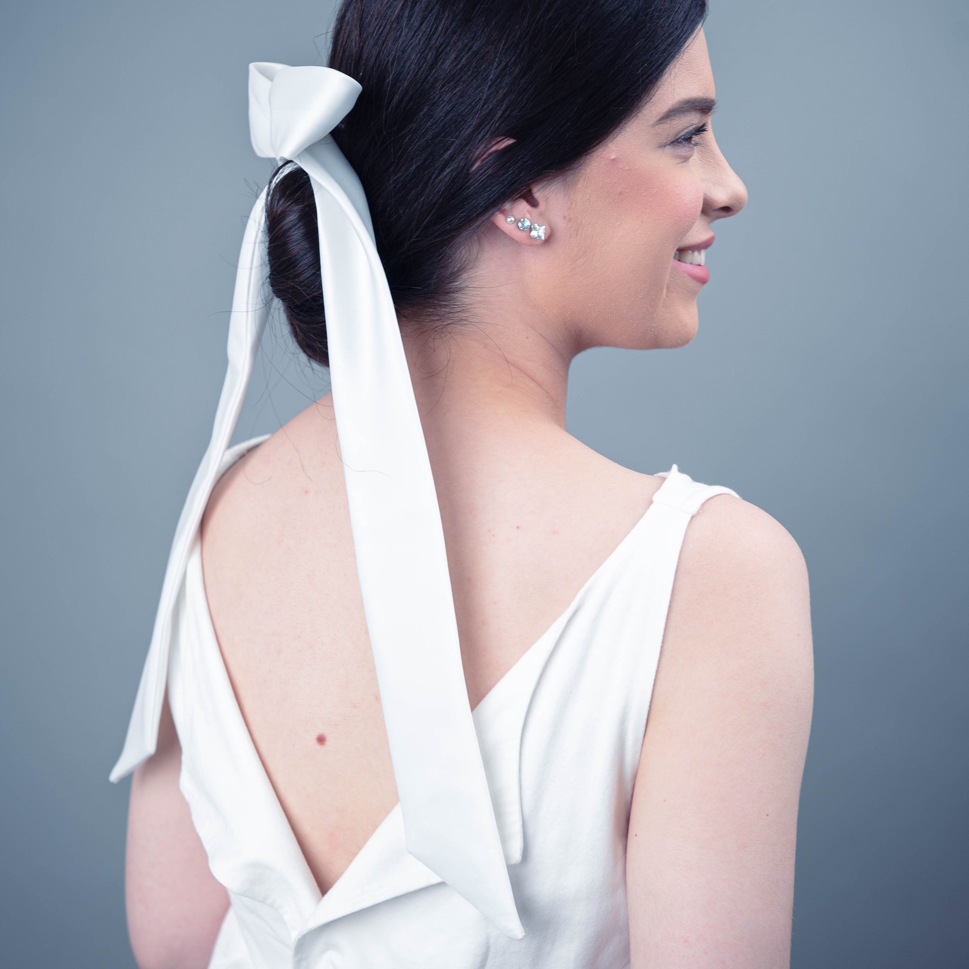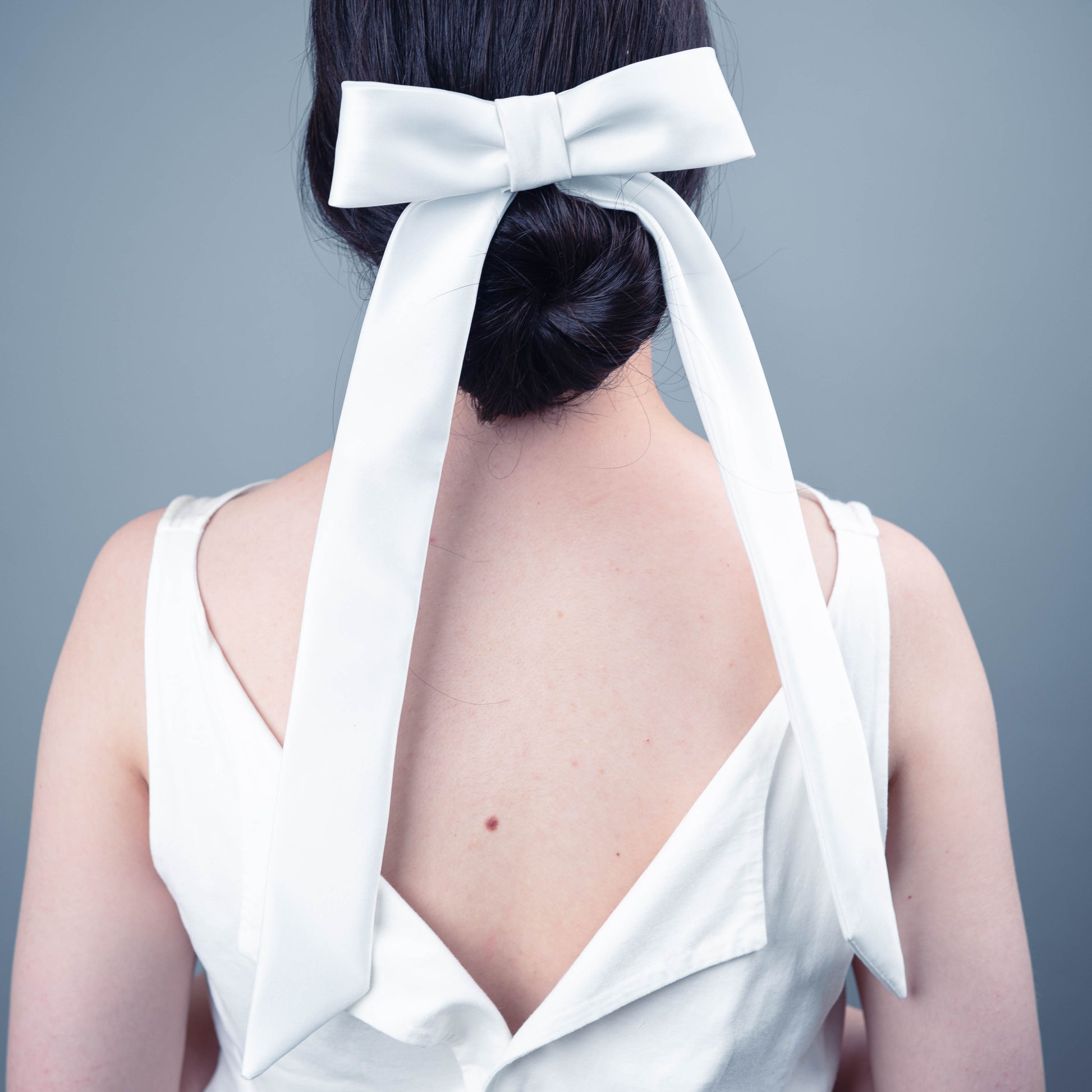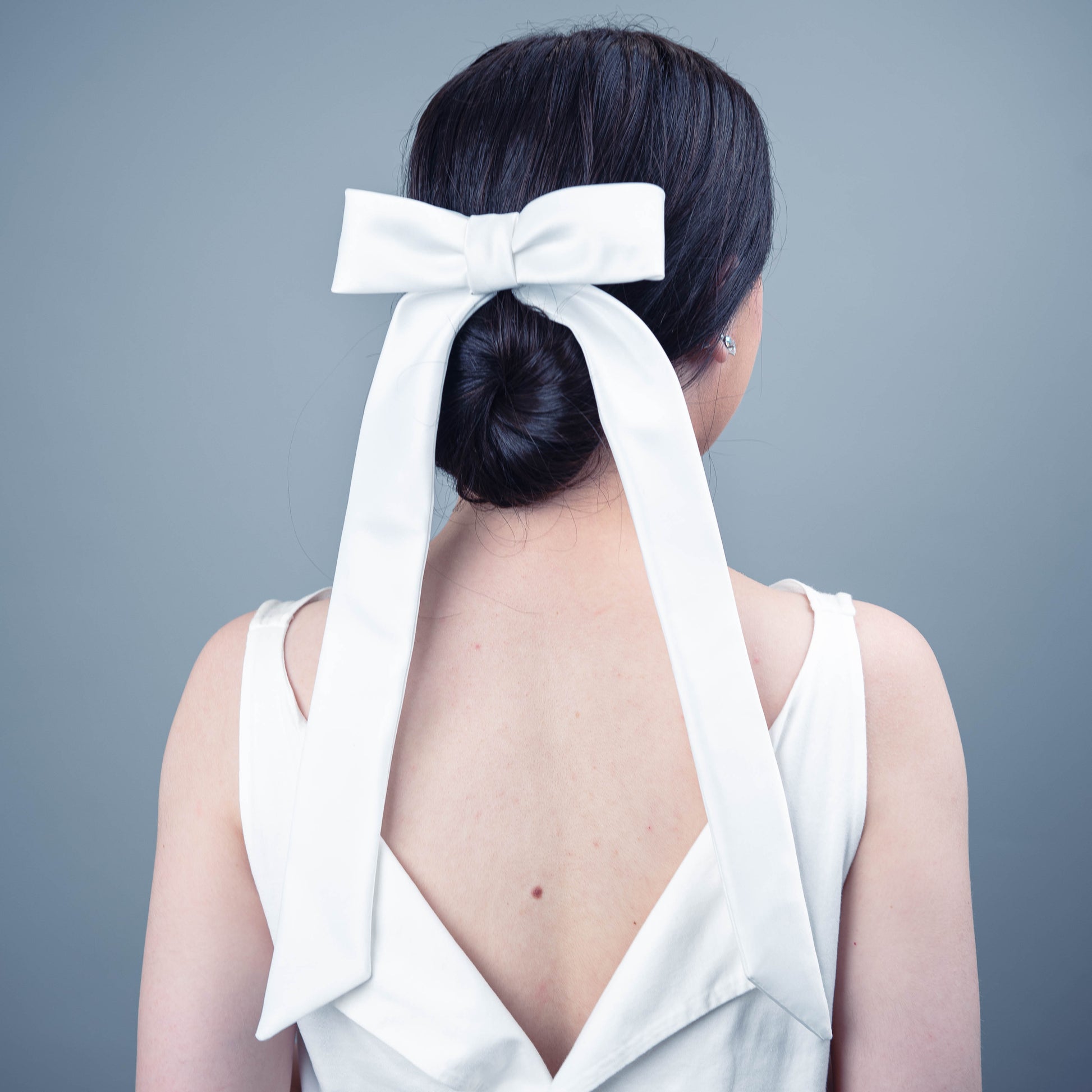Everything I Do is a striking shaped bow created with beautiful satin fabric. The piece is secured with a comb and can be worn at the back of the head.