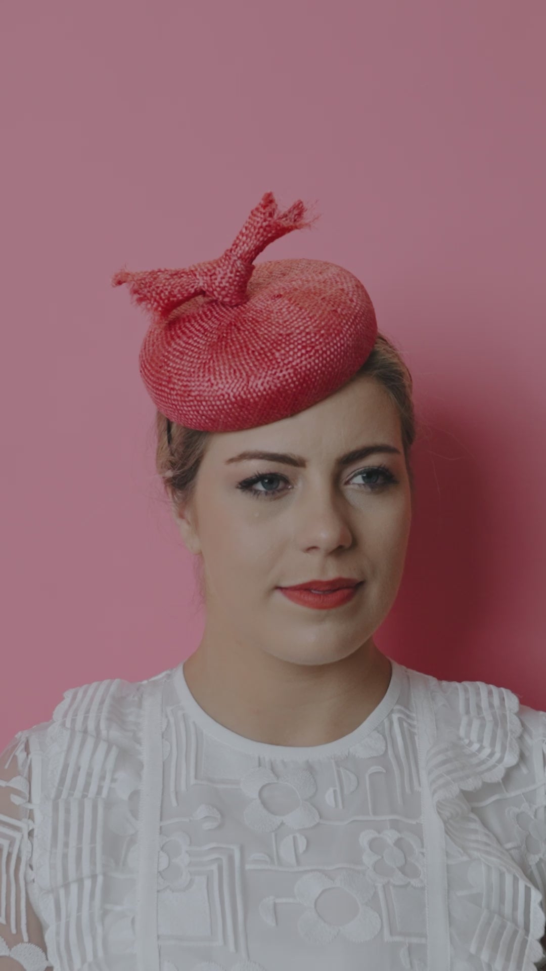 The Michelle Beret is a small round beret in textured straw with a balancing knotted trim. This style is one size fits all and is secured to the head with a shaped base, elastic and comb.