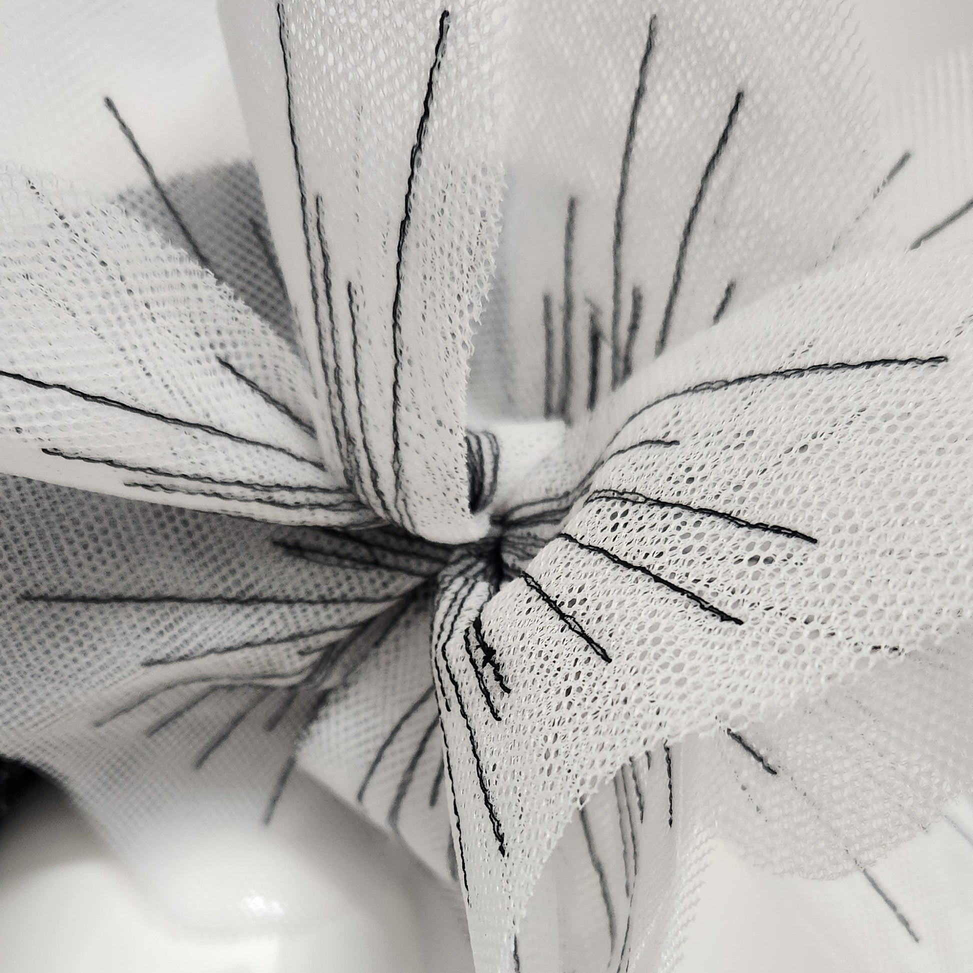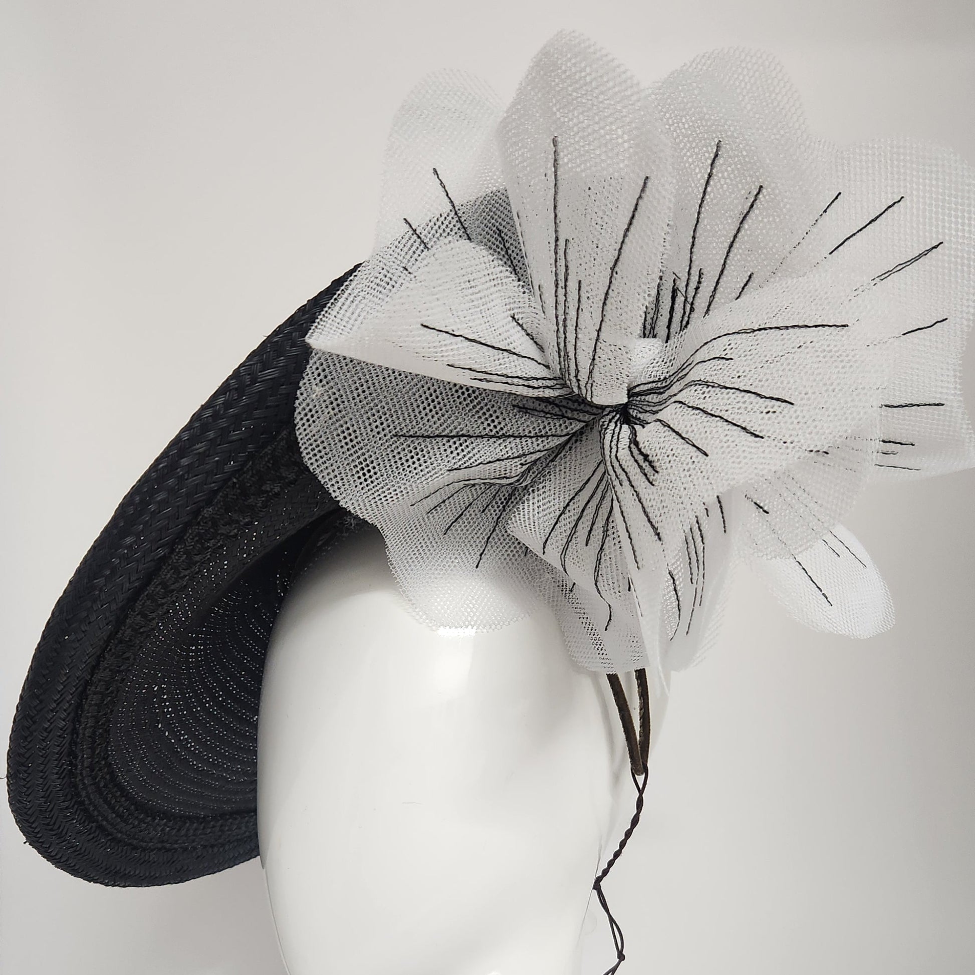 Monique Saucer in Textured Straw Poppy Flower Trim in Black and White Spring Racewear Headpiece